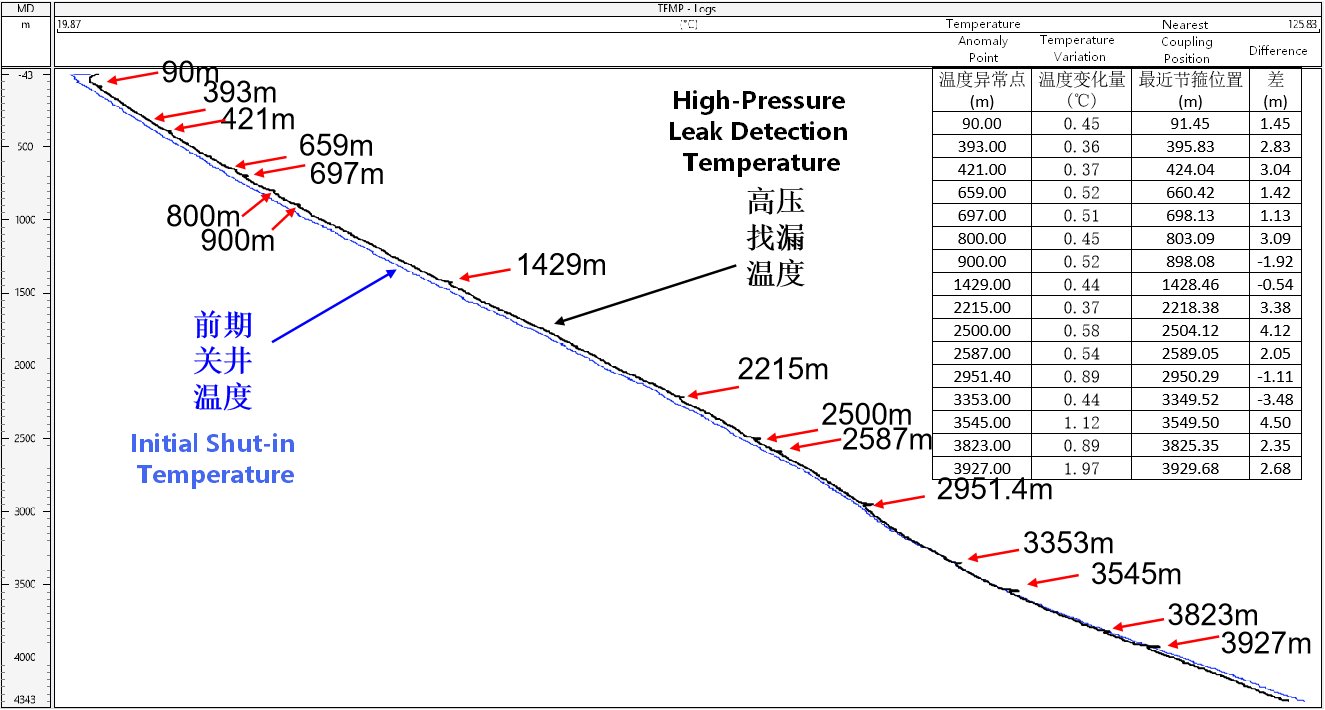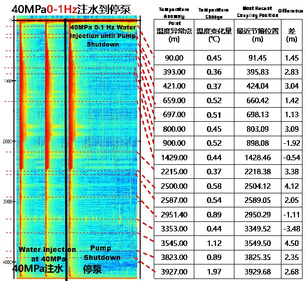 Наблюдение: Анализ данных волоконно-оптического каротажа для обнаружения утечек выявил 16 отдельных точек температурных аномалий с помощью DTS. Анализ водопадной диаграммы DAS показал, что аномалии акустической энергии тесно коррелируют с этими температурными аномалиями.